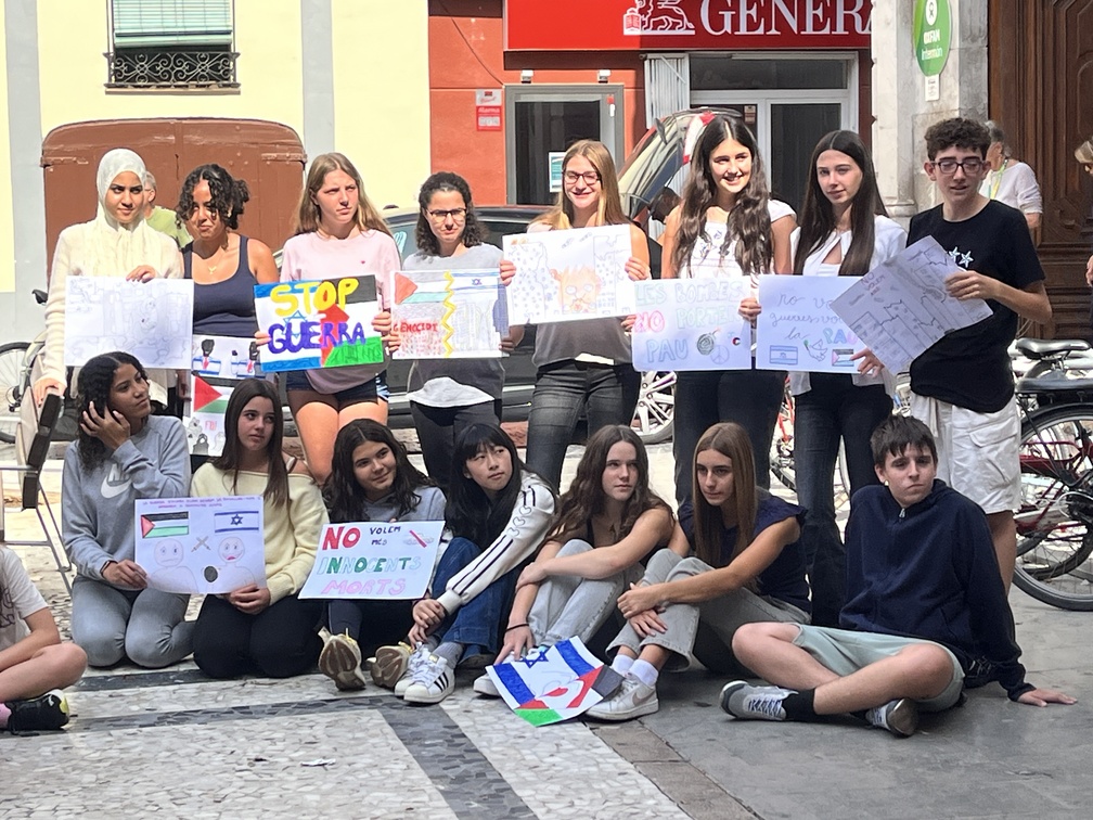 El divendres 3 d’octubre, a les 12.30 h, a la plaça dels Cotxes, l’alumnat de secundària ha llegit un manifest que ha anat seguit d’un minut de silenci en record de totes les víctimes. I després un grup d’alumnes ha tocat “El cant dels ocells”. Aquesta iniciativa ha estat proposada i liderada pels mateixos alumnes, que han manifestat la voluntat de visibilitzar el seu desacord amb la situació que pateix el poble palestí, així com amb qualsevol forma de violència i conflicte armat arreu del món. També s’ha penjat una pancarta elaborada per l’alumnat a la façana de l’edifici amb el lema “DAVANT LA VIOLÈNCIA, EL DIÀLEG ÉS LA SOLUCIÓ”.